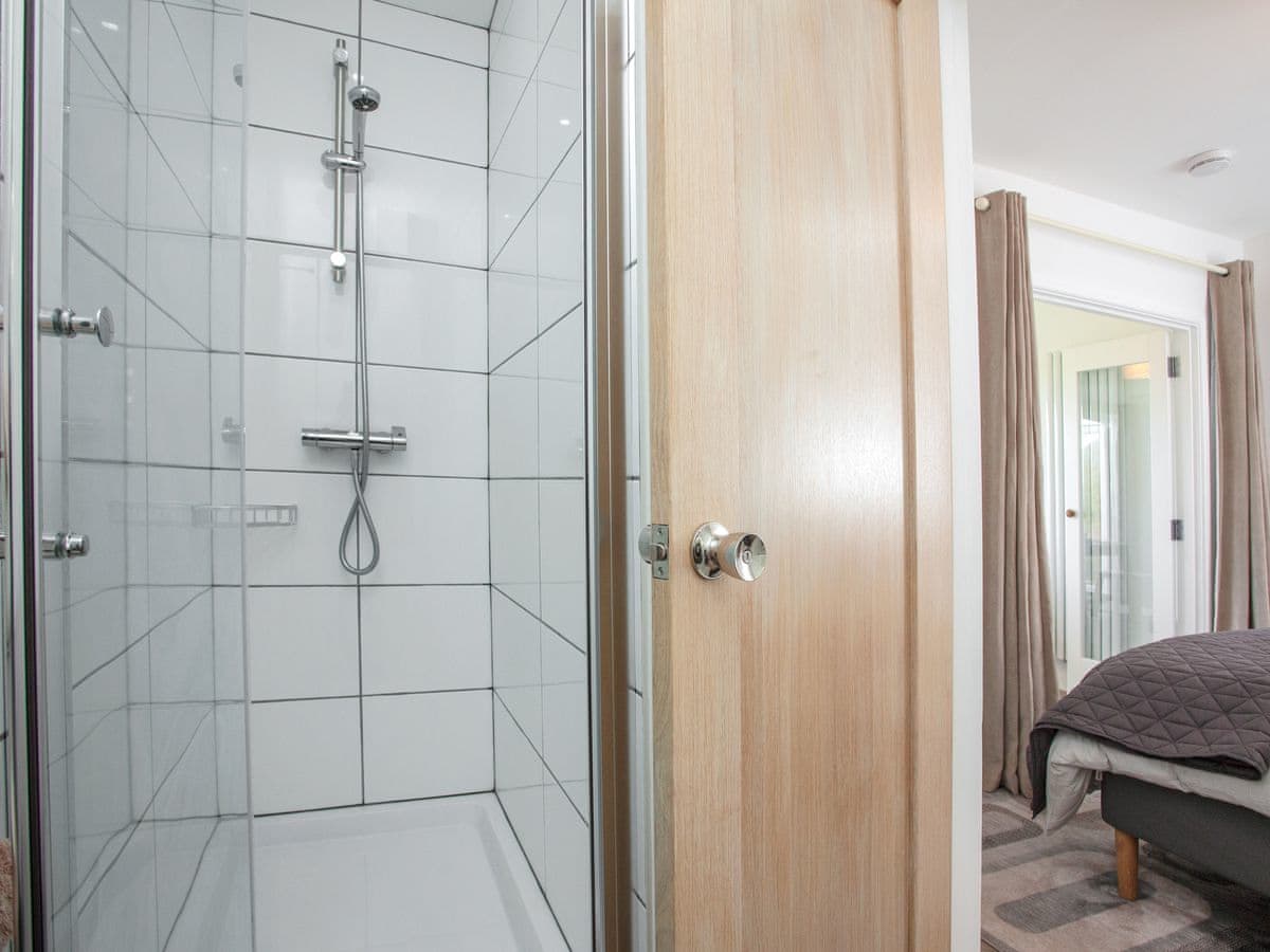 Steps lead up to the balcony with its glass balustrades and then to an open-plan living and dining area with its window-wall giving unrivalled views over the local countryside. Glass french doors lead into the bedroom and thence to the bathroom with large walk-in shower.