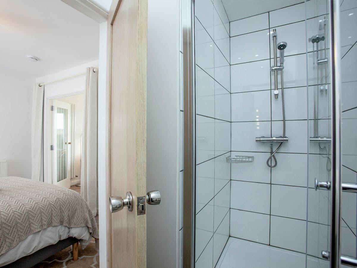 Steps lead up to the balcony with its glass balustrades and then to an open-plan living and dining area with its window-wall giving unrivalled views over the local countryside. Glass french doors lead into the bedroom and thence to the bathroom with large walk-in shower.